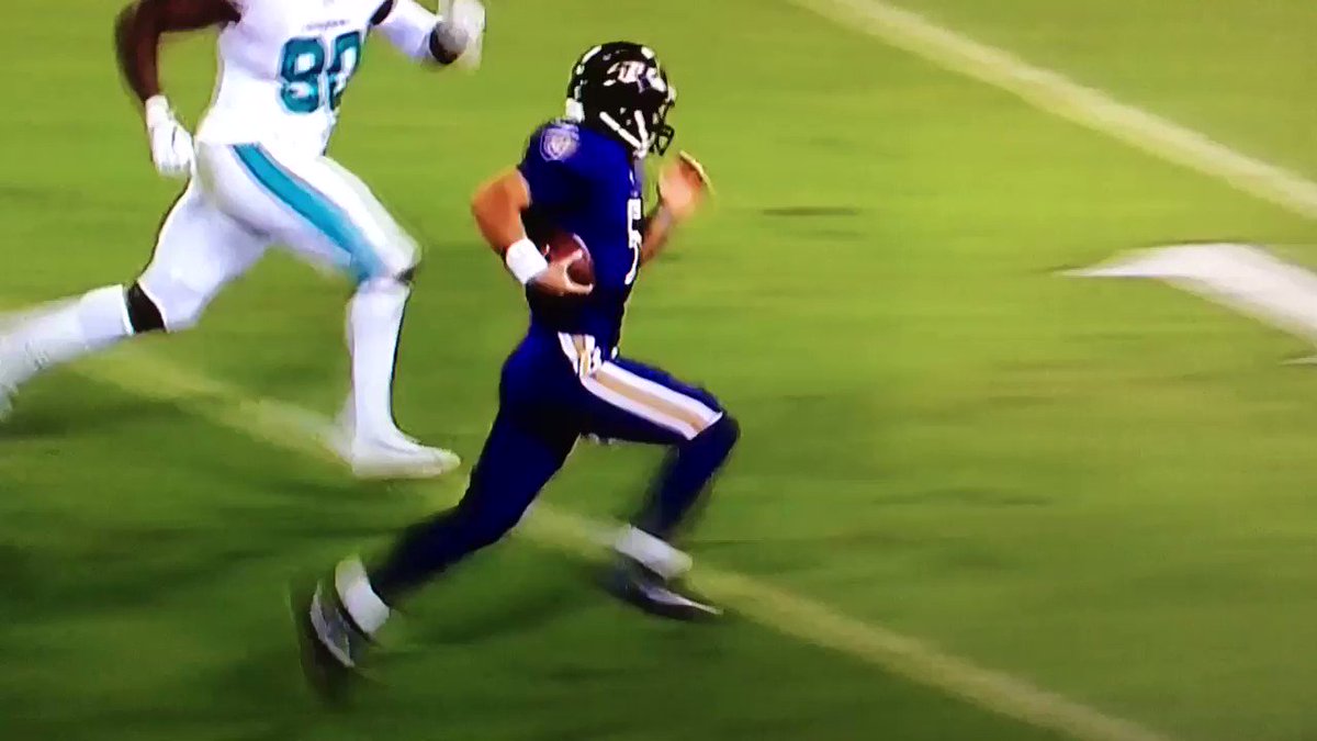 With 3:13 remaining in the second quarter of a 40-0 victory, Flacco rolled to his right on 3rd-and-10. None of his receivers worked their way open, and the 6'6", 245-pound signal-caller lumbered toward a first down. Alonso bore down on Flacco with the intent to stop him from converting a first down.