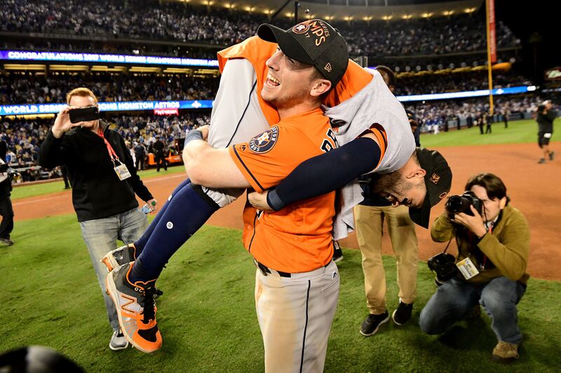 Alex Bregman and Jose Altuve of the Houston Astros celebrate after defeating the Los Angeles Dodgers to win the 2017 World Series at Dodger Stadium on Nov. 1.